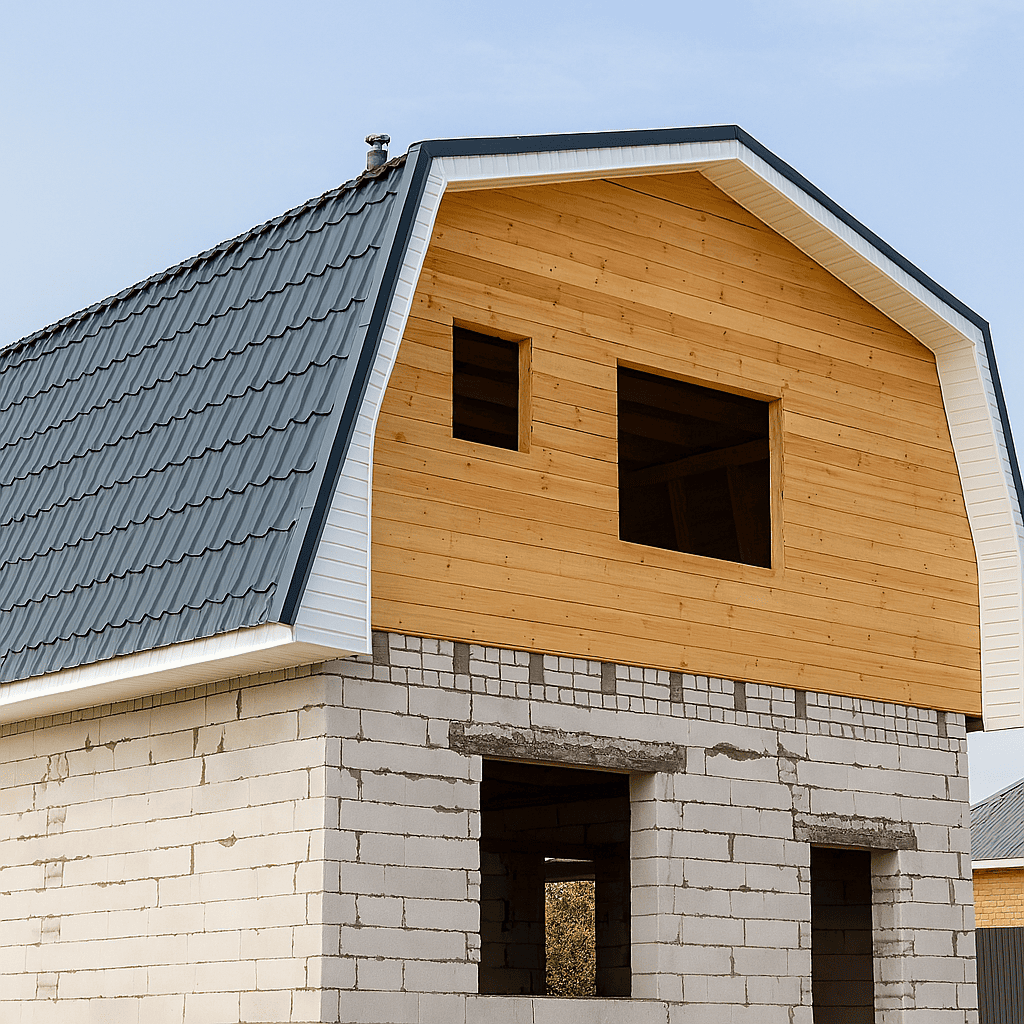 Осуществляется монтаж кровли: металлочерепицы, мягкой кровли или другого материала — в зависимости от проекта и бюджета. - Установка водосточной системы и доборных элементов